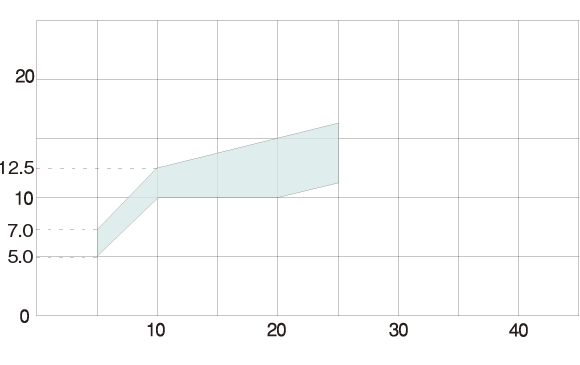 ワーキングジョイントの目地深さ(シーリング材の厚さ)は目地幅との関係と必要接着面積から決定し、図(2.1)にある許容範囲内に納まるように設定します。