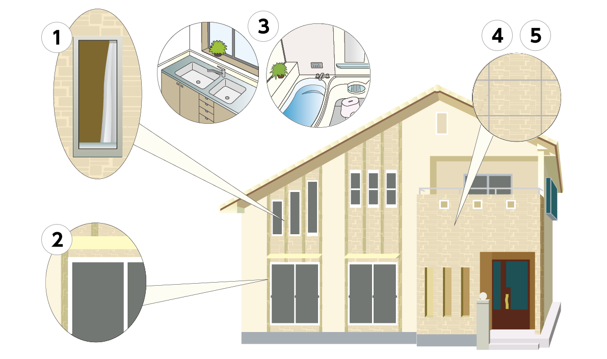 窯業系サイディングボード、コンクリート、サッシ回り、タイル